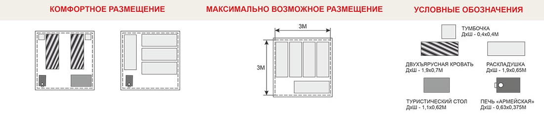 • Вместимость палатки до 4 человек на двухъярусных кроватях.
